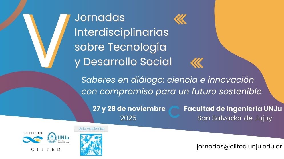 El Centro Interdisciplinario de Investigaciones en Tecnologías y Desarrollo Social para el NOA (CIITeD), unidad ejecutora de doble dependencia CONICET/UNJu, invita a toda la comunidad a participar en las Jornadas Interdisciplinarias de Tecnología y Desarrollo Social a realizarse los días 27 y 28 de noviembre de 2025 en Facultad de Ingeniería - UNJu, Ítalo Palanca N°10, San Salvador de Jujuy. Este año el lema es "Saberes en diálogo: ciencia e innovación con compromiso para un futuro sostenible", con el propósito de compartir y debatir conocimientos, experiencias prácticas y propuestas que surgen del trabajo interdisciplinario colaborativo entre las distintas disciplinas científicas.